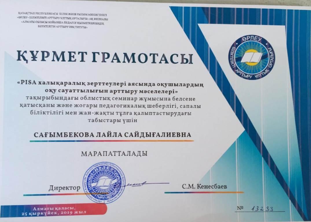 Мектебіміздің қазақ тілі мен әдебиеті пәнінің мұғалімі Л.С.Сағымбекова "PISA халықаралық зерттеулері аясында оқушылардың оқу сауаттылығын арттыру мәселелері" тақырыбында өткен облыстық семинарға белсене қатысып, құрмет грамотасымен марапатталды.